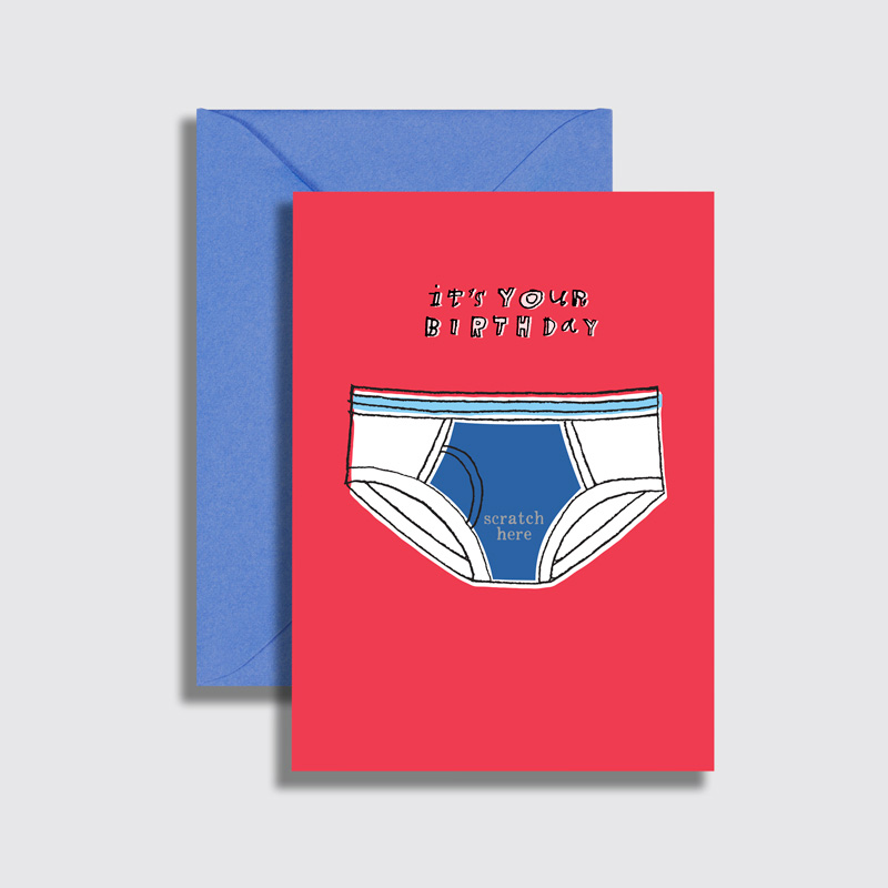 Scratch Off: I hear it’s a BIG one Interior Message: Blank Size: 4.5″ x 6.25″ Paper: Premium white greeting card stock Envelope: Azure blue