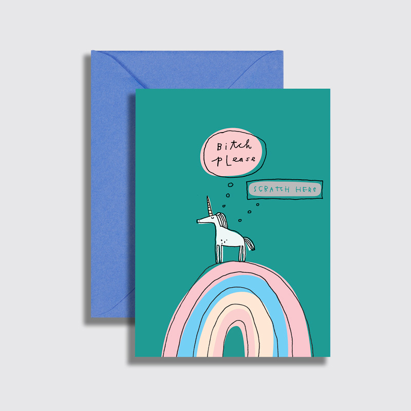 Scratch Off: I’m a unicorn Interior Message: Blank Size: 4.5″ x 6.25″ Paper: Premium white greeting card stock Envelope: Azure blue